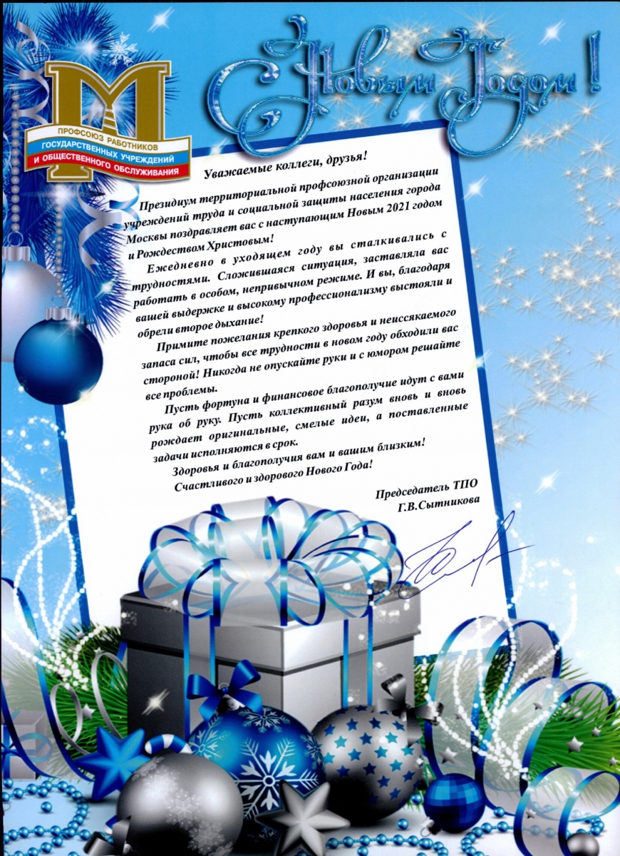 По инициативе Территориальной профсоюзной организации Департамента труда и социальной защиты населения города Москвы, в лице ее председателя Сытниковой Галины Валентиновны, коллективы всех стационарных учреждений, работающих вахтовым методом получили к Новому году сладкие подарки.
