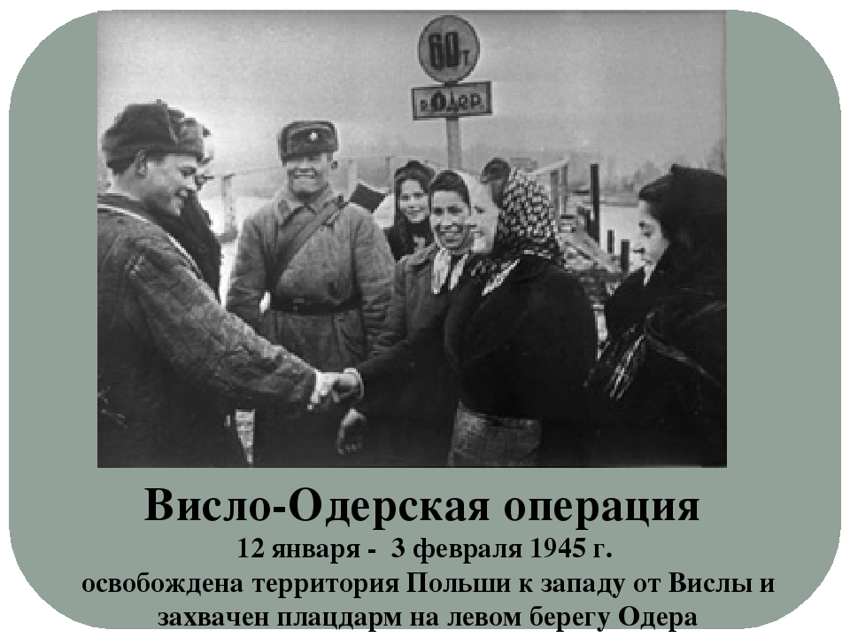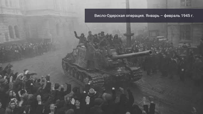 Висло - Одерская наступательная операция — это стратегическое наступление советских войск на правом фланге советско - германского фронта в 1945 году. Началась 12 января и завершилась 3 февраля. Проводилась силами 1- го Белорусского (командующий — маршал Г. Жуков) и 1 - го Украинского фронтов (маршал Советского Союза И. Конев). В ходе Висло - Одерской операции от немецких войск была освобождена территория Польши к западу от Вислы и захвачен плацдарм на левом берегу Одера, использованный впоследствии при наступлении на Берлин. Операция носила стремительный характер — на протяжении 20 суток советские войска продвигались на расстояние от 20 до 30 км в день. За это время они преодолели 7 укреплённых рубежей противника и 2 крупные водные преграды. По внутреннему 55 – телеканалу состоится трансляция документального фильма «Вторая мировая война: «Висло - Одерская операция»
