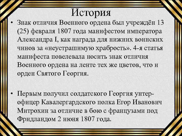 25 февраля 1807 года был учрежден Георгиевский крест. В один из первых дней января месяца года 1807 на стол Императора и Самодержца Российского Александра I легла записка, в которой говорилось о необходимости учредить «5-й класс или особое отделение Военного ордена Св. Георгия для солдат и прочих нижних воинских чинов… который может состоять, например, в серебряном кресте на Георгиевской ленте, вдетой в петличку». 25 февраля 1807 был издан манифест Александра I, который утвердил награду для нижних чинов «за неустрашимую храбрость». При этом предусматривалось, что награждать будут «с некоторой разборчивостью», то есть с учетом действительных заслуг. В манифесте прописали все, - и порядок награждения, и условия для вручения, и внешний вид. Новая награда повторяла орден святого Георгия как внешним видом, так и условиями для награждения. Изначально награда была без номера, - вручалась она не так уж и часто, а вот когда число награжденных стало увеличиваться (поводов для вручения военных наград в то время было хоть отбавляй), георгиевские кресты стали нумеровать. Первым, кто получил солдатского Георгия стал унтер-офицер Митрохин. Вскоре началась Отечественная война 1812 года и количество награжденных по понятным причинам выросло. В 1813 году солдатская награда была вручена графу Милорадовичу, который на момент награждения был генералом от инфантерии. Знак отличия вручали не только военным: мещанин Герасимов стал первым из гражданских, представленных к награде. Правда, в отличие от военных, гражданские лица после награждения не могли именоваться «кавалерами знака отличия». При новом императоре, Николае Первом, был немного изменен статут ордена Святого Георгия. Изменения коснулись и условий награждения нижних чинов. Теперь награду жаловать могли и командующие армиями, и командующие отдельными корпусами. Награждать стали почти без проволочек. Третье награждение теперь позволяло получить максимальную прибавку к жалованию, а сама награда могла носиться на роскошном банте цветов георгиевской ленты. В 1844 году ввели кресты для нехристиан, прежде всего это касалось мусульман – изображение святого Георгия заменили на вполне нейтральный герб Российской империи. Еще через 12 лет ввели степени – их стало сразу четыре, при этом кресты первых двух классов были изготовлены из золота, а последние – из серебра. В 1913 году было введено пожизненное денежное поощрение кавалерам: от 36 рублей за четвертую степень, до 120 рублей за первую. В этом же году произошло последнее изменение статута: награда стала официально называться Георгиевским крестом и могла вручаться посмертно. «Нехристианской» версии теперь уже не было – на все кресты вернули изображение святого Георгия. Георгиевский крест никогда не снимался. Награда просуществовала до 1917 года. А спустя 75 лет Георгиевский крест возвратился в наградную систему нашей страны. Для наших уважаемых ветеранов по внутреннему 55 телеканалу Пансионата состоится трансляция исторического документального фильма «Георгиевский Крест - История легендарной награды Российской Империи».
