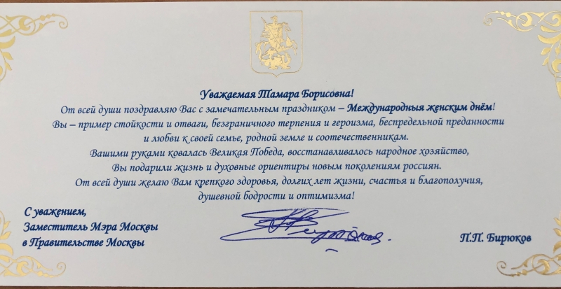 Заместитель Мэра города Москвы в Правительстве Москвы, Председатель Попечительского совета ГБУ ПВВ «Коньково» - Пётр Павлович Бирюков поздравил именными поздравительными открытками прекрасную половину коллектива ветеранов Пансионата с Международным женским Днём 8 Марта!