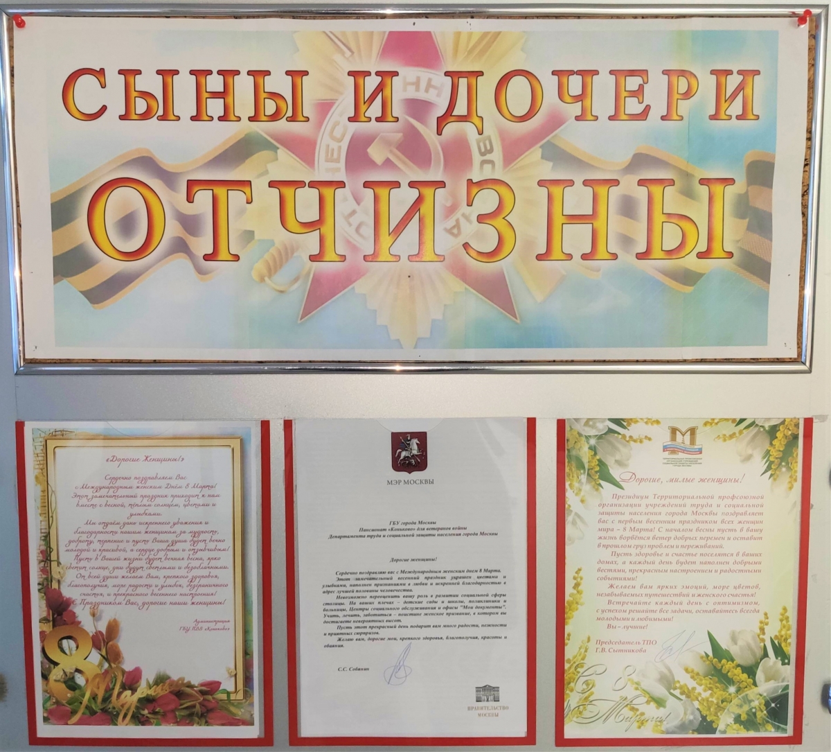 В преддверии праздника Международного женского Дня - к 8 Марта мы по традиции украсили наш стенд «Сыны и дочери Отчизны». Яркие поздравления и наилучшие пожелания от Мэра города Москвы Сергея Семёновича Собянина, от Председателя Президиума территориальной профсоюзной организации учреждений труда и социальной защиты населения города Москвы Галины Валентиновны Сытниковой и от Администрации ГБУ ПВВ «Коньково». Наши дорогие женщины - ветераны Великой Отечественной войны с большой радостью приняли поздравления и выразили слова благодарности за поздравления, за постоянную заботу и внимание к ним.